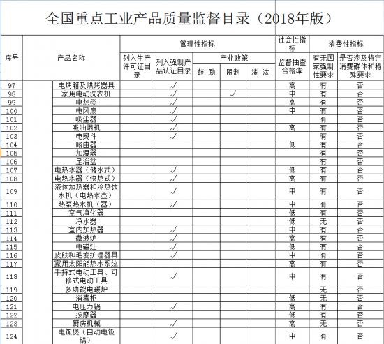 2018年4月初,国家市场监督总局在总结《全国重点工业产品质量监督目录(2017年版)》实施经验的基础上,经向社会公开征集意见建议,综合分析监督抽查、生产许可、风险监测、消费者投诉、网络舆情等情况,科学确定产品风险等级,总局制定了《全国重点工业产品质量监督目录(2018年版)》,黑白电、厨电、卫浴、生活小家电等众多家电品类均在《目录》列表内。