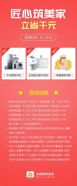 早在7月,金螳螂.家就发起了“匠心筑美家 千万答谢礼”为每一位选择金螳螂.家的客户,送去满满的祝福和清凉。从减压party到春节家书再到用好酒致敬生活,追忆毕业后的时光等一系列活动, 8月优惠活动还将继续,可关注金螳螂.家官网/金螳螂.家装修APP了解优惠详情。金螳螂.家坚信一次装修,一场相遇,亦有缘分成为一生朋友。