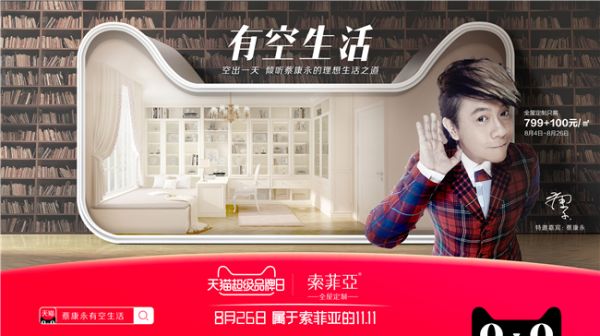 本次活动是索菲亚第二次天猫超级品牌日,为传递“拥有自己的时间、空间”的生活,索菲亚邀请集主持人、导演、作家等多重身份的明星蔡康永作为本次活动特邀嘉宾,分享他的生活之道。蔡康永的人生哲学和说话艺术改变了许多人对生活的看法,也因此被称为生存“导师”;在生活上,蔡康永则是一个内敛沉稳的人,喜欢阅读的他,有独特的方法让自己异于常人:繁忙的行程中依旧能将自己从工作中抽离。蔡康永的多重身份与独特的生活态度与索菲亚本次“有空生活”的理念高度切合,倡导消费者慢下来,重新审视自己的生活,找到更优的生活方式。