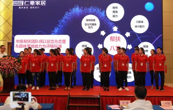 以仁豪新组建的新进大学生储干为代表的帮扶团队将峰会现场氛围带向了高潮,为了更好的服务仁豪经销商,市场部成立三人组的企业帮扶团队,与三维家进行战略合作,快速出图,减轻终端门店人员的设计压力,帮助经销商更好的服务客户。