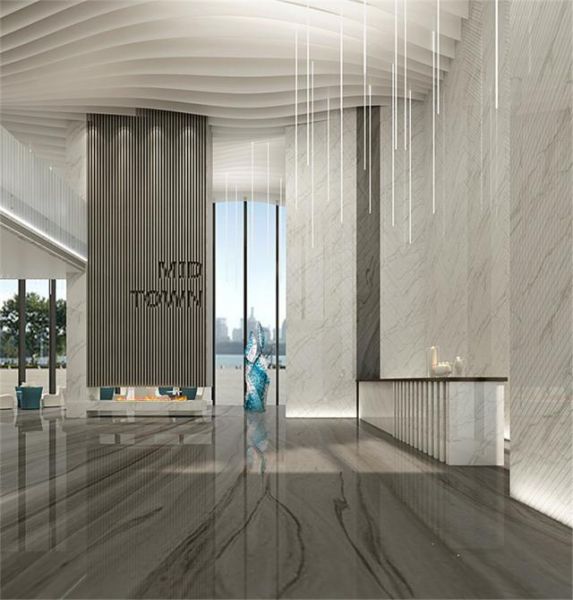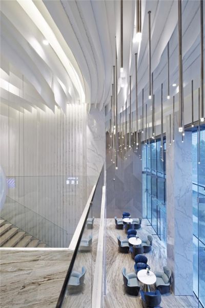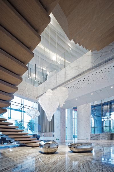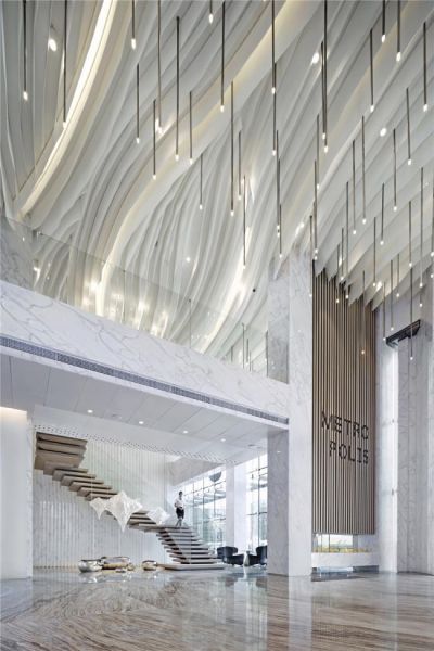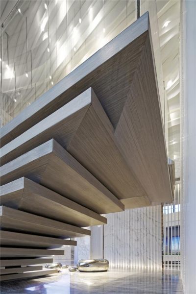 设计在水的运用上富于变化,凝聚着各种巧思,被演变的钱塘江,以吊顶的川流汩汩、灯饰的粼粼微光、墙面与地面石材的流水纹理、透光幽微的艺术装置等形式重现在空间中。在光影变化下,空间气韵流动而又静美,壮阔磅礴却不乏精细,让人不知不觉脱离了日常,沉浸在自然与梦幻的感知之中。