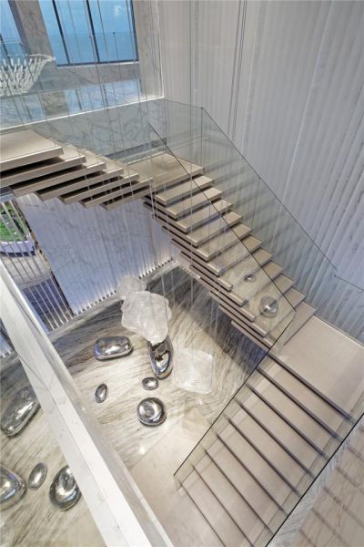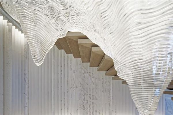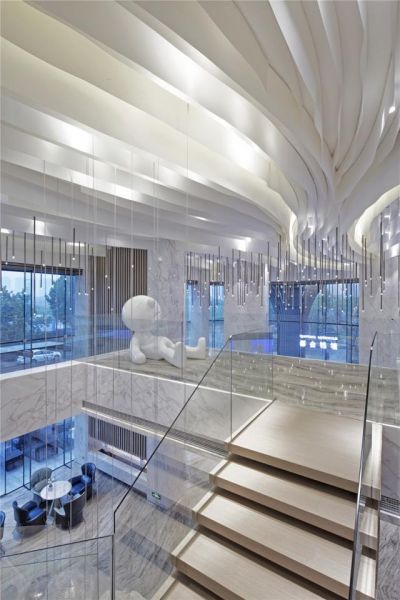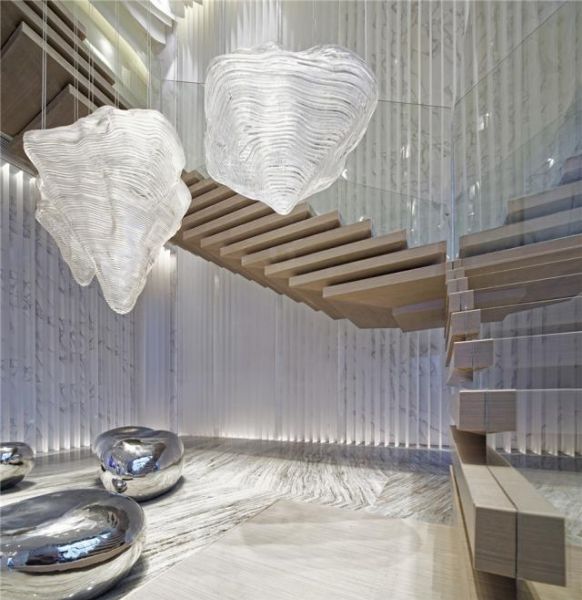 空间正中构筑了一个无柱的、曲折向上的楼梯,由定制的漂浮木制板与通透的玻璃砌筑而成,视觉上打破了白色的纯粹。楼梯下方的大型艺术装置“山水倒影”,晶莹剔透的亚克力材质和抽象多变的手法,紧扣杭城下沙当地秀美的山水文化,如泉水滴落,击石以歌,灵透幽微的气韵萦绕四周,虚实相映。