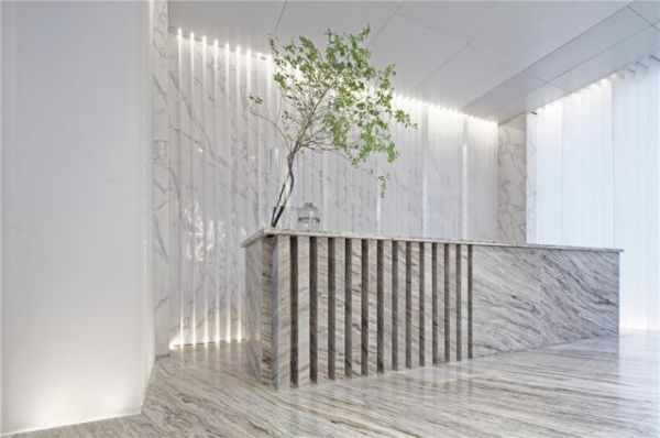 空间结构由下往上表现为由重到轻的形态与质感,空间气质凝练而彰显气度。悬挂的艺术吊顶,采用特殊工艺制成轻盈的弧形纸带铺陈,垂坠的点点灯光缀之,仿似日光倾洒下荡漾着幽幽粼光的江面,与地面石材的纹理轻语呼应,形成空间的意境。灵动感、表象性、光泽度、时尚感,共同构成格调空间当代美学的重要元素,象牙白大理石,轻盈质感的玻璃、亚克力,天然木材……呈现轻柔温和的动态美感。
