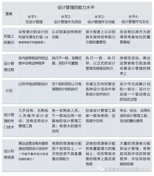 企业往往习惯性地对单个设计师寄予过高的希望,但现代设计,尤其是商业化设计,已经不能再全赖设计师个体对自己灵感所做出的随机性响应,也不能再按照老板的经验和直觉行事。而是需要依靠团队的力量和智慧。而团队的作用只有在战略目标清晰的基础上才能发挥正向作用。设计管理的作用日益凸显,不同的企业其水平截然不同,如下表所示。