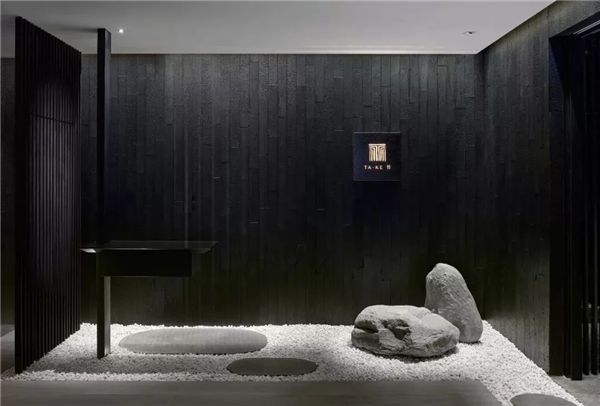 设计师充分利用竹的独特形态和天然气质,以富有变化的竹元素贯穿各个区域。古朴的木纹,炭黑色的墙面,白色鹅卵石铺设的枯山水景观,隐隐透出日式庭院的静谧。