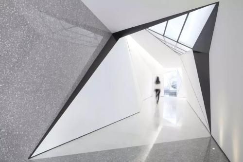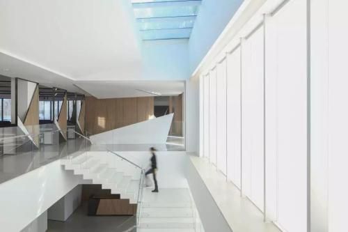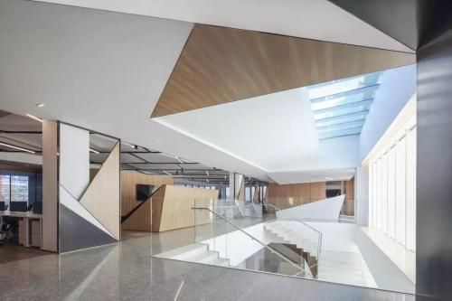 室内空间的几何视觉通过线面构成,天花射灯如同舞台轨道灯,形成不同的层次,视觉得到极大丰富。三角切面及天窗,构筑出为特殊来宾而打造的走廊,以光线展现线条。办公室的主通道是楼高两层的楼梯,一整面大气的落地玻璃视野开阔,室外光景饱览无遗,即使工作再繁重也能过滤心情,发散思维。
