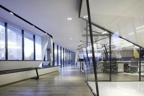 影视艺术创造的是视觉、思想、情感与想像,PAL则以空间艺术冲破乏味而规律的办公空间,为北京陌陌影业的办公室灌入全新的视觉。融汇建筑设计将室内空间汇入几何线面,在灵动、开拓无拘束的办公视界激活思维。