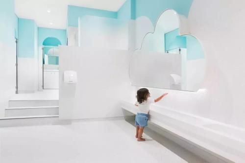 开放式的咖啡厅,为孩子与家长的互动留足空间,舞台背景配合灯光变化,为戏剧教学和认知技能的发展提供理想课堂。感官室由水、沙、光组合而成,隐藏于房间内各个角落的魔术盒,让孩子运用各种感官探索周围的环境。梦幻般的学习环境,孩子们可以在「云下」洗手,水龙头则神奇地形成瀑布,从多角度为孩子打造「玩乐」场景,将学习回归「纯粹」。