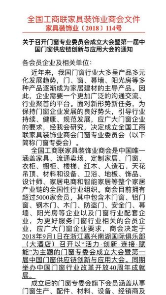 面对新形势新任务,为保持门窗企业发展的良好势头,引导行业持续、健康、规范发展,应广大门窗企业的要求,经全国工商联家具装饰业商会研究,决定成立全国工商联家具装饰业商会门窗专业委员会(以下简称门窗专委会)。