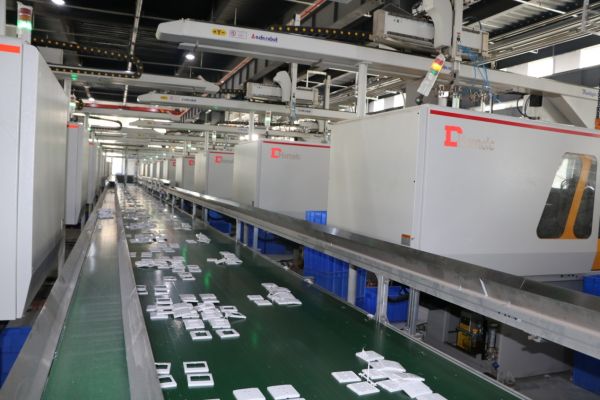 通过集中供料系统将塑胶颗粒送入注塑机,经过融化、注射等8个环节,大大节约了人力成本、提高了生产效率和产品稳定性。