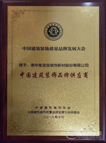 2018年10月26日,由中国建筑装饰协会主办,中国建筑装饰协会质量分会、北京中装新联文化发展有限公司承办的“中国建筑装饰质量品牌发展大会”在北京盛大召开。德华兔宝宝装饰新材股份有限公司作为主要协办单位参与大会,并在大会中荣获“中国建筑装饰品牌企业”和“中国建筑装饰品牌供应商”双奖项。