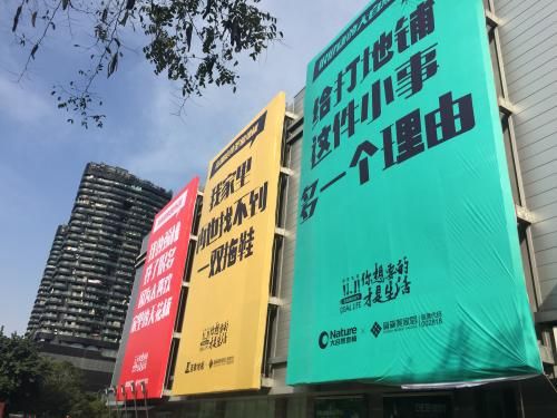 昨天下午,6面巨大的喷绘被挂在富森美家居城南2号店外立面,这6幅色彩饱和度极高、生活诉求非常明确的态度海报,替代了以产品和单价为主视觉的传统海报。在全民参与的“11.11”消费节点到来之前,将黄金广告位换成巨大的网红海报,富森美家居又准备搞什么大事情?