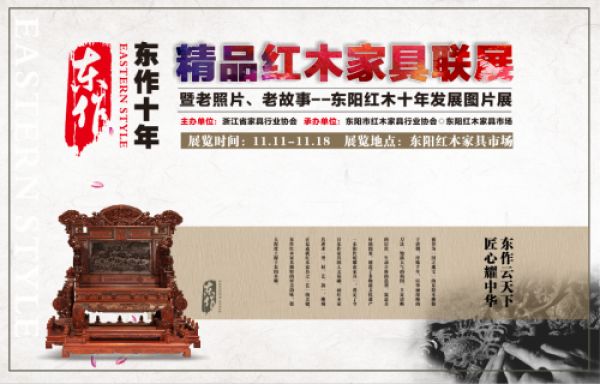 记者获悉,从11月10日至11月18日,在东阳红木家具市场将分别举办“东作”十年精品红木家具联展和“老照片、老故事”--东阳红木十年发展图片展。据介绍,本次“东作”十年精品联展将在东阳近千家企业挑选50件代表“东作”匠人高超设计和精湛手艺的精品红木家具,集中展现近10年来“东作”红木流派的发展成果,引领中国红木家具发展潮流。