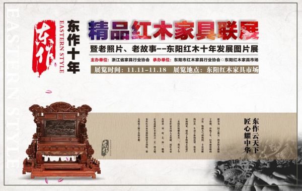 记者获悉,从11月10日至11月18日,在东阳红木家具市场将分别举办“东作”十年精品红木家具联展和“老照片、老故事”--东阳红木十年发展图片展。据介绍,本次“东作”十年精品联展将在东阳近千家企业挑选50件代表“东作”匠人高超设计和精湛手艺的精品红木家具,集中展现近10年来“东作”红木流派的发展成果,引领中国红木家具发展潮流。