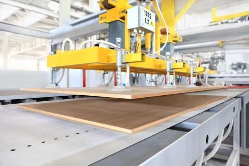 刚进来,就在德国温康纳压贴线看见一张张被高温压贴好的板材不断涌出,经过初级加工的板材表面已经就很光滑平整,丝毫没有硌手的感觉,凑近板材仔细观看,板材表面十分平整,装饰图案与板材结合度好,让人一眼就能看出其中蕴含的好工艺。