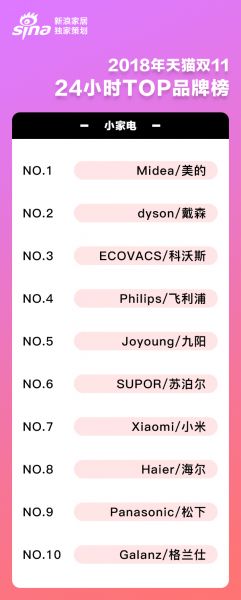 大小家电皆为榜上客的美的,今年双十一可谓大丰收。除此之外戴森、科沃斯、飞利浦、九阳等也都是今年天猫双十一24小时的top品牌。