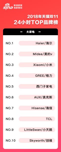 海尔、美的、小米分别为大家电榜单的前三名。今年双十一,“解放双手”的智能家电成为天猫爆款。炒菜机器人、扫地机器人、擦窗机器人等“不动手”系列家电均热销。 天猫IoT团队与海尔、小天鹅、老板电器等品牌共同研发的产品,也成为今年家电领域的大势产品。