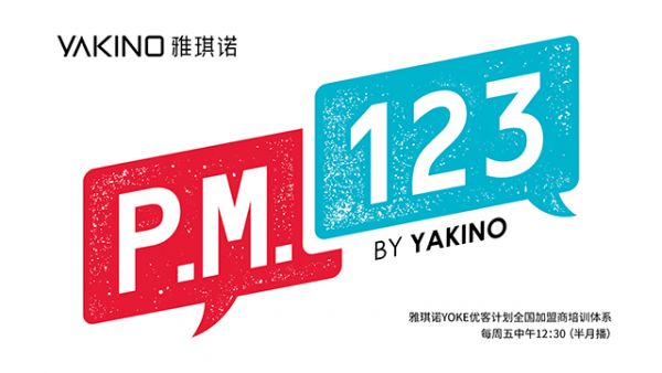 《P.M.123》,是雅琪诺Yoke优客计划培训版块中的一档访谈类科普直播栏目,该档栏目以半月播形式播出,在周五中午12:30准时开播。每期节目,雅琪诺将邀请各版块的负责人,向观众分享Yoke优客计划详细内容,同时落实加盟体系运营过程中,涉及的相关知识以及技能培训。