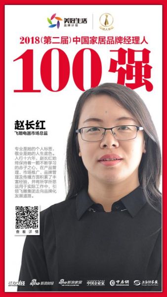 2018年12月12日,在北京举行的“致敬改革开放·致远美好生活——2018中国地产新时代盛典”现场,“2018年(第二届)中国家居品牌经理人评选”结果揭晓。飞雕电器集团有限公司市场总监赵长红荣获“2018中国家居品牌经理人100强”。