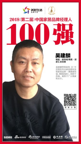 2018年12月12日,在北京举行的”致敬改革开放·致远美好生活——2018中国地产新时代盛典”现场,“2018年(第二届)中国家居品牌经理人评选”结果揭晓。博美·装饰城、博美·居家汇总经理吴建麟荣获“2018中国家居品牌经理人100强”。