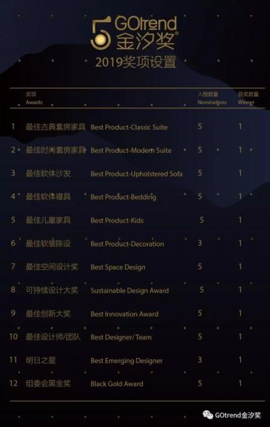 第5届金汐奖参评作品必须为第34届深圳国际家具展参展作品,参评类别分为产品、展位、设计师三大类别。