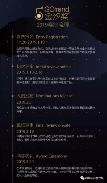 首先,新一届金汐奖报名工作从11月20日开始启动,以线上报名的形式收集信息资料,由评委团作线上初评;其次,在2019年3月初,我们将对外发布入围名单;最后,评委团将会对位于第34届深圳国际家具展现场的入围作品进行现场评审,评选出最终的获奖者。