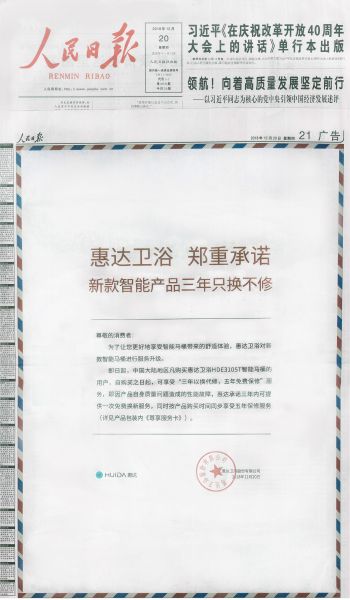 人民日报上宣布服务升级,惠达卫浴“只换不修”将领跑智能卫浴下半场