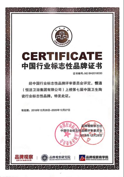 12月28日,由中国商业经济学会、全国品牌社团联席会、品牌观察杂志社、品牌观察研究院、品牌观察商学院、北京国信品牌评价科学研究院联合举办的第7届中国行业标志性品牌颁奖仪式在福州举行,恒洁荣膺行业唯一的「2018中国卫生陶瓷行业标志性品牌」,与同时上榜的华为、格力、方太等各自行业的标志性品牌一道,共显中国品牌风采。