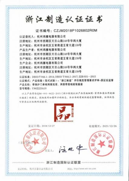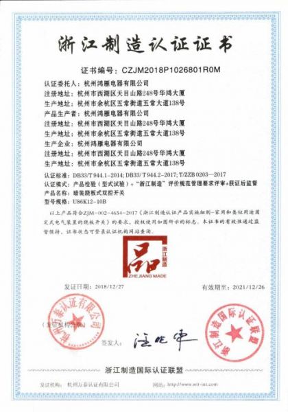 2018年8月,鸿雁启动本次“浙江制造”认证筹备工作,质量管理部牵头成立项目推进工作组,经过半年筹备,12月底,经第三方认证机构连续3天的现场考评,“暗装跷板式双控开关”(型号U86K12-10B)及“带保护门单相两极双用、两极带接地暗装插座”(型号U86Z223A10)两项产品通过“浙江制造”认证。