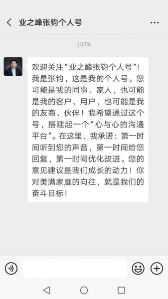 关注这个号的人,可能是张钧的同事、家人,也可能是他的客户、用户,还可能是他的友商、伙伴。不管他是谁,张钧都希望通过这个号,搭建起一个“心与心的沟通平台”。他承诺:会在这里第一时间听到您的声音,第一时间给您回复,第一时间优化改进。您的意见建议是我们成长的动力!你对美满家庭的向往,就是我们的奋斗目标!