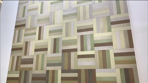 【翟音】:有一款产品叫“莫奈印象”,这是我为森林之星设计的第一款产品。后来这个系列也一直在进行各种各样的研发,刚开始的时候我们做了十一组,我希望色彩能够给家居空间带来一种特别的色调,这种色调可能是冷色的也可能是暖色的。我希望地板是极具有存在感又不是很张扬的存在,所以我设计了这款地板,后来我们把莫奈印象进行了一系列的演变,像我身后这块莫奈印象是混合了几种色系拼接起来的,假如说在一个比较大的空间中时,它既有一种渐变的效果同时很柔和很有色调感。