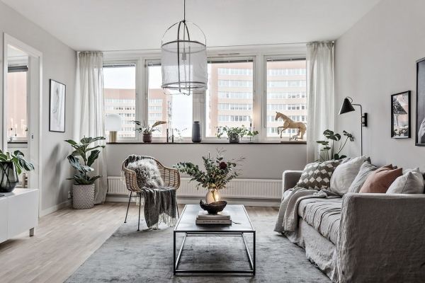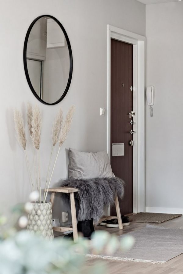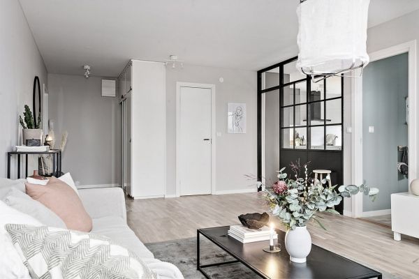 这套公寓没有玄关,入门即是客厅,换鞋凳摆放在门的左侧,上方挂一面镜子,出门可以整理一下面容。客厅整体的家居风格采用的是经典的北欧灰白搭配,浅色系给人以素净雅。室内摆放很多绿植,作为生活家的装点,很惬意。