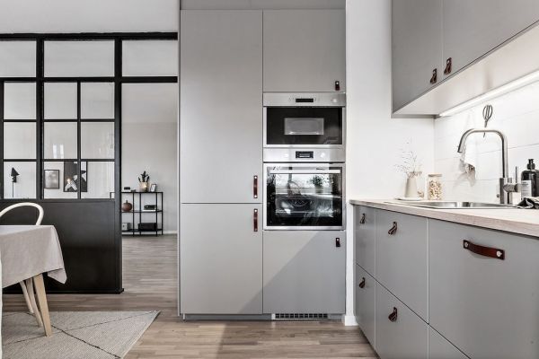 客厅的灯饰很别致,遮光罩仍旧选用白色装饰,和室内整体色调氛围保持一致,厨房用用玻璃门进行了隔断处理,没有采用流行的开放式厨房。这样的设计也并不影响整套公寓的通透性。