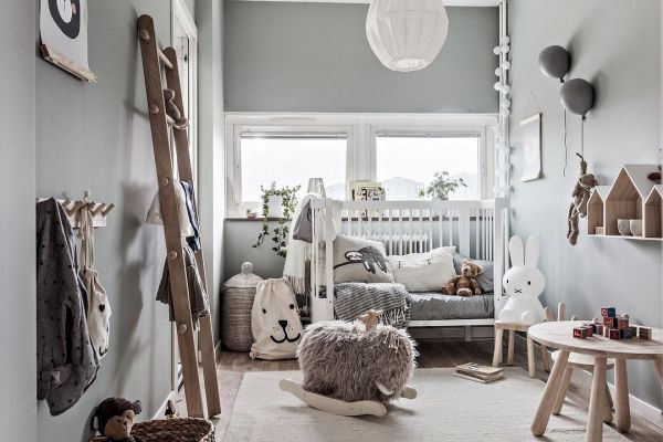 儿童房内各种小摆件,木质桌椅摇椅,加上地毯,能够保证儿童在玩耍时候的安全性。