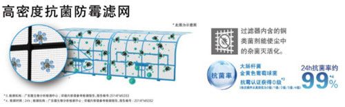 而且,空调过滤网里面太脏,耗电量就大大增加了,空调的使用寿命也会缩短。所以定期清洗空调十分重要。可清洗空调却是一个费力、费时的事。选购松下HE系列能够自清洁的空调会让你省力又省心。其“秘密武器”就在于高密度抗菌防霉滤网,内含铜类菌剂能使尘中的杂菌灭活化,有效阻断各类细菌,24小时抗菌率高达99%,持续吹出洁净新风。