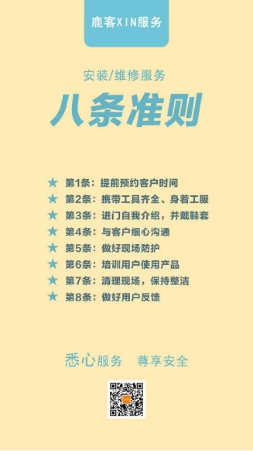 鹿客还为安装服务人员制定了八条准则,以保证服务水准的统一性:(1)提前预约客户时间;(2)携带工具齐全,身着工服;(3)进门自我介绍,并戴鞋套;(4)与客户细心沟通;(5)做好现场防护;(6)培训用户使用产品;(7)清理现场,保持整洁;(8)做好用户反馈。