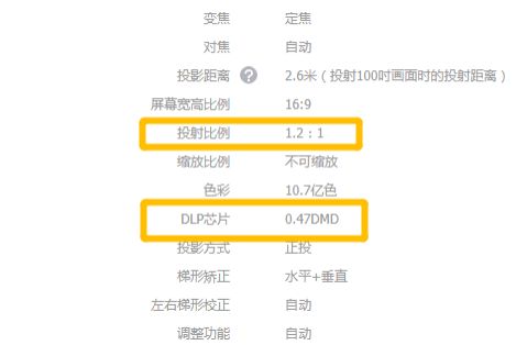 这个参数关系到空间大小,记住一点就行,参数越小越方便,数值比例越小,在一定距离里,就能投放出越大尺寸的画面。无论是在餐厅、客厅、卧室,都能随时随地投放,不受空间的局限。我买的这款,投射比为1.2:1,,60寸的投放画面,只需要约1.5m的距离就可以了,完全不受限。