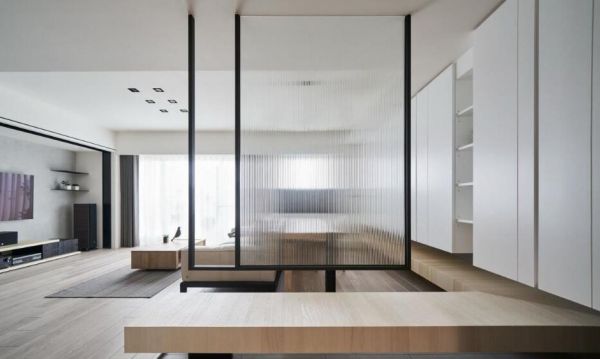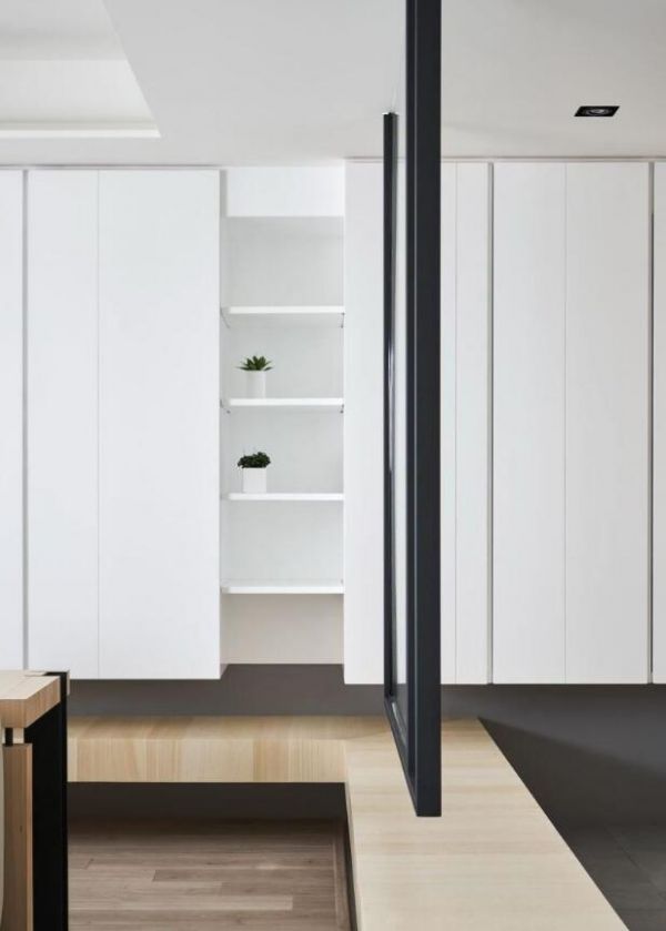 打开门,不想一眼望穿阳台,便以直纹玻璃+黑色铁件,装置简洁清爽的隔屏,并以悬空的设计巧思,嵌合一道层板,弯折延伸入内,导引视线,不仅于玄关处自然形成穿鞋的矮座,也顺势沿墙打造柜体,让纯白和木色搭出层次分明的对话。