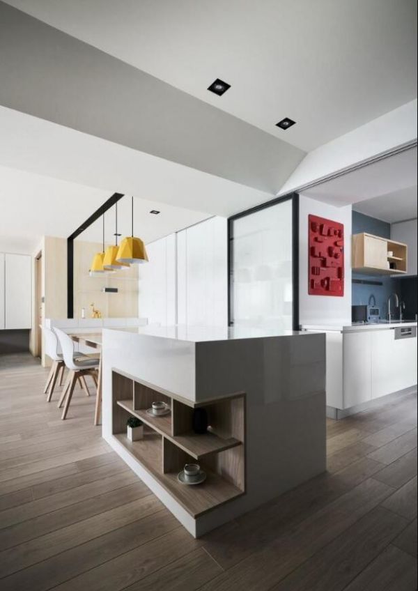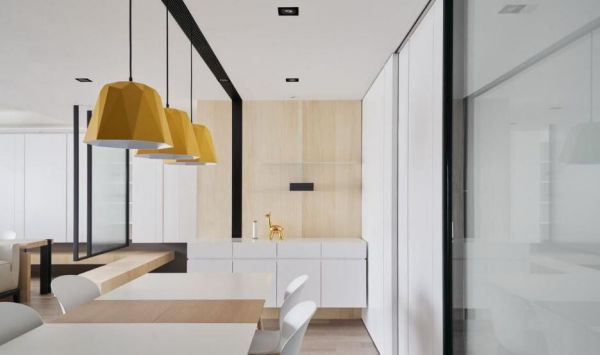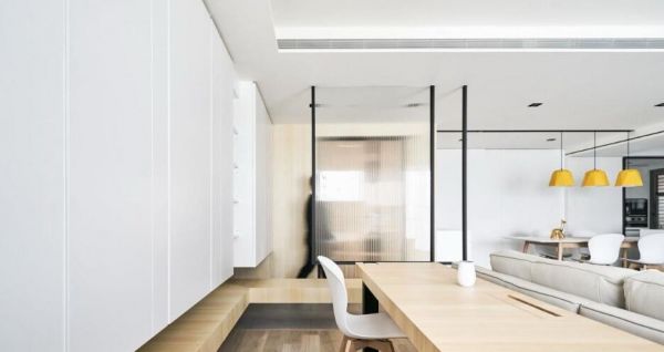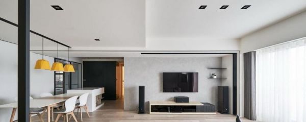 公共领域左侧以长桌结合中岛拉出自成一格的美味空间。尤其天花,结合冷气出风口和吊灯,以一路延伸的黑色沟槽折向墙柜,为清浅的色调深刻刚毅的线条。餐厅白墙且以滑轨拉门隐藏两间储藏室,打开其一,即可弹奏钢琴伴随浪漫晚餐。