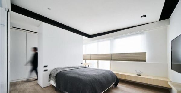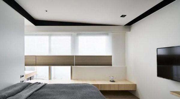 主卧以斜面天花搭配不规则的黑色框线,既修饰天花大梁也引导视觉上提。床头则以不做满的白色柜体为隔间墙,让窗边的卧榻连结化妆桌一路贯穿到更衣室,形成内外穿透的空间感。狭长的小孩房则以整合卧榻和衣柜的设计,释放出完整的空间。