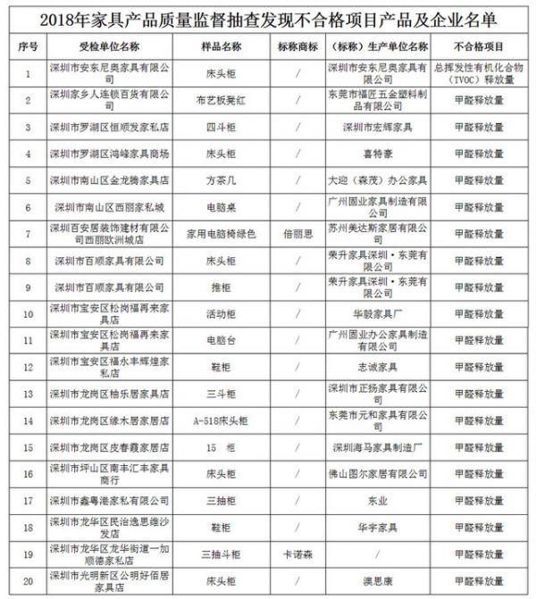 据悉,本次抽检,家具类产品共抽查了深圳市生产和流通领域的71家受检单位生产、销售的家具产品,抽检样品共170批次,合格产品150批次,不合格产品20批次。本次家具产品监督抽查发现的不合格项目为:甲醛释放量和总挥发性有机化合物(TVOC)释放量。