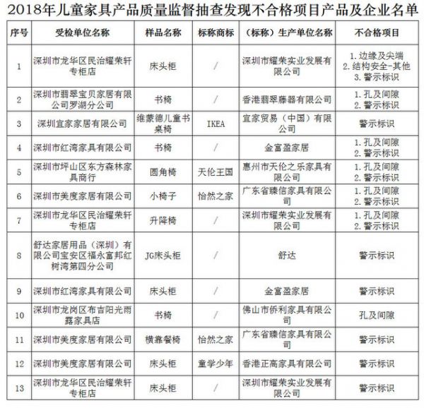 近日,深圳市市场监督管理局网站分别通报了2018年家具产品质量监督抽查结果和2018年儿童家具产品质量监督抽查结果。家具类,东莞市元和家具有限公司、深圳海马家具制造厂等20家企业被检出不合格产品;儿童家具类,宜家、舒达等13家企业赫然在列。
