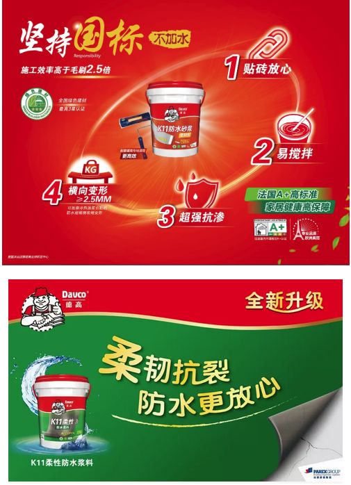 德高防水材料的优点可不仅仅只有这些。它是由特种改性聚合物与多种添加剂、干粉混合均匀后得到的柔韧的防水膜,它与混凝土及砂浆基面有这出色的附着力,能构成紧密巩固的并具有出色的耐久性防水涂层,施工方便,省时省力,极大的提高了施工效率,比如德高K11防水砂浆的系列产品,施工面积更大,让施工更省心。