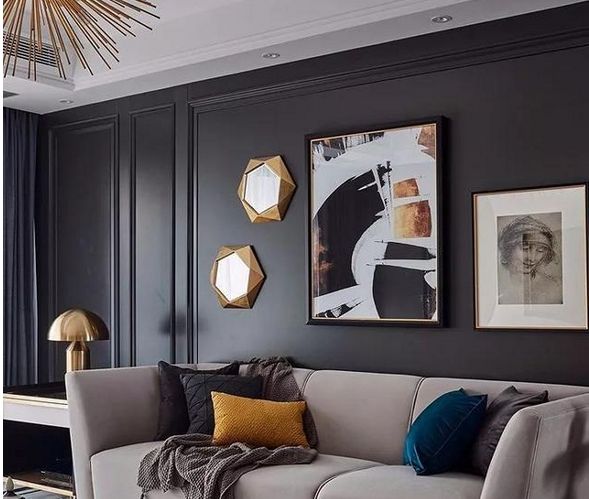 护墙板采用大面积黑色,若觉得单调的话,可以添置一些绿植,或者在沙发上添加一些针织品、柔软的沙发坐垫,让居家感十足,生活变得更加惬意。