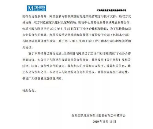 公告表示,鉴于红星控股及其相关子公司是国内领先的家具建材及家居商场、购物中心等的综合运营服务商,阿里在新零售领域拥有先进的经营理念与技术支持,经双方友好协商,双方同意在家具建材及家居商场、购物中心及其他业务领域开展业务合作,红星控股与阿里已于2019年5月15日签订了业务合作框架协议。
