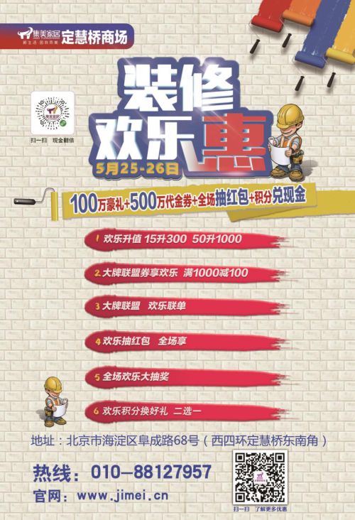 正是看准了这个时机,集美家居定慧桥商场在5月25-26日重磅推出“装修欢乐惠”酬宾营销活动,并有一系列的优惠大礼奉上。如果您家也在计划或已经开始装修,最近不妨来集美家居定慧桥商场逛逛。