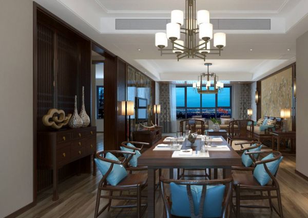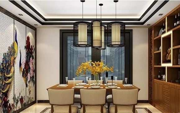 对于餐厅来说,墙面设计最终是为居住者营造出舒心、愉悦的用餐氛围。上图是一款典雅中式餐厅,整个餐厅空间相对来说较大。右侧设计一排博古架酒柜,非常的实用和典雅。而餐厅另一边墙面采用护墙板设计,选用了孔雀鲜花图,色彩艳丽多姿,寓意是吉祥美好,让餐厅看起来典雅而不失浪漫。