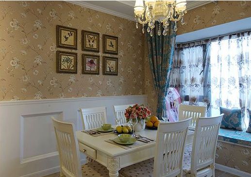 护墙板背景墙的高度有很多种,比如有全墙面、半墙设计等等,此款餐厅采用的是半墙护墙板设计。设计师将墙面一分为二,上半部分采用了浪漫的浅棕底色的碎花墙布,悬挂一组花鸟装饰画做点缀,将田园气息发挥的淋漓尽致,下半部分选用白色韩式护墙板,显得更加清新怡人。米色的餐桌椅,搭配浅棕色小碎花的坐垫,与背景墙上的墙布完美呼应。喜欢小清新的亲们不妨参考一下此款护墙板设计哦。
