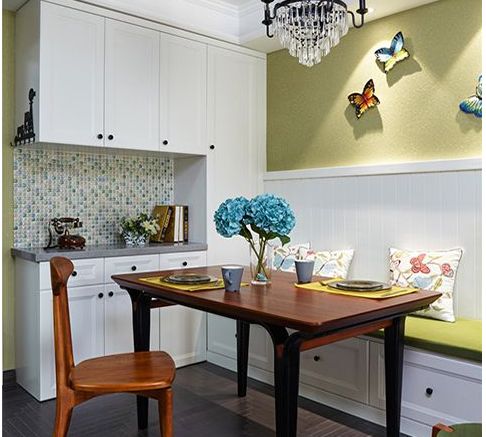 美式风格给人最大程度上的自由,不经意间打造随性的浪漫。上图餐厅虽然积较小,而卡座的设计解决了小户型空间不足的尴尬。卡座的设计将墙面分开,靠背采用护墙板设计,上方制作浅绿色的墙面,加入了三只翩翩飞舞的彩色蝴蝶,卡座左侧采用收纳柜设计,非常的实用。