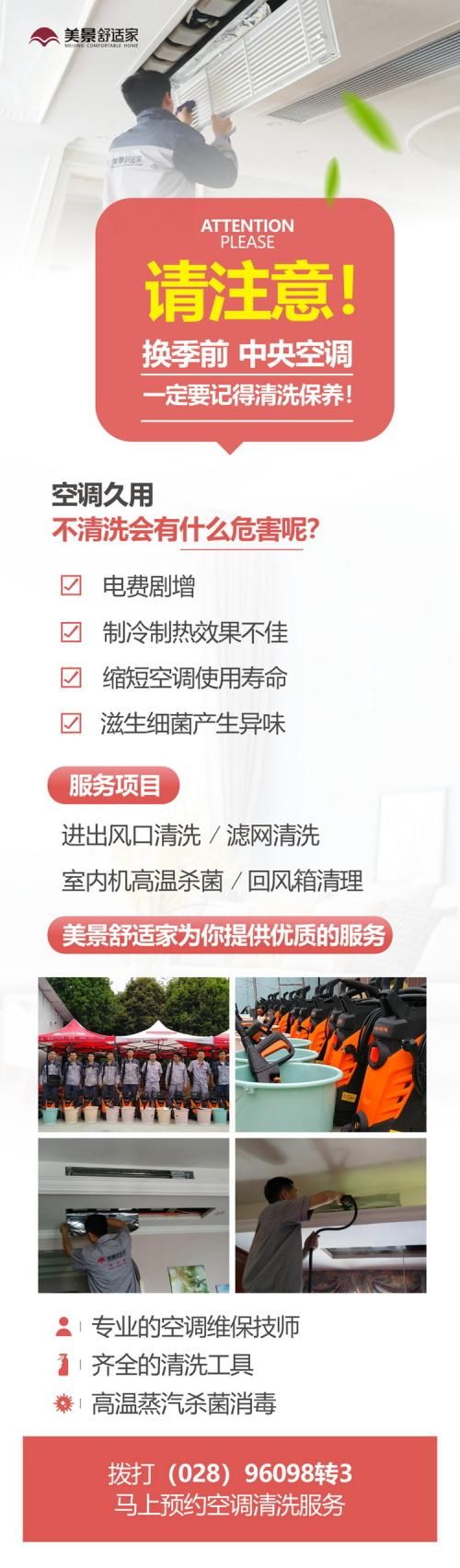 说到专业清洗,美景舒适家拥有专业的空调维保技师,齐全的清洗工具,高温蒸汽杀菌消毒,让你的空调更经久耐用,寿命更长。
